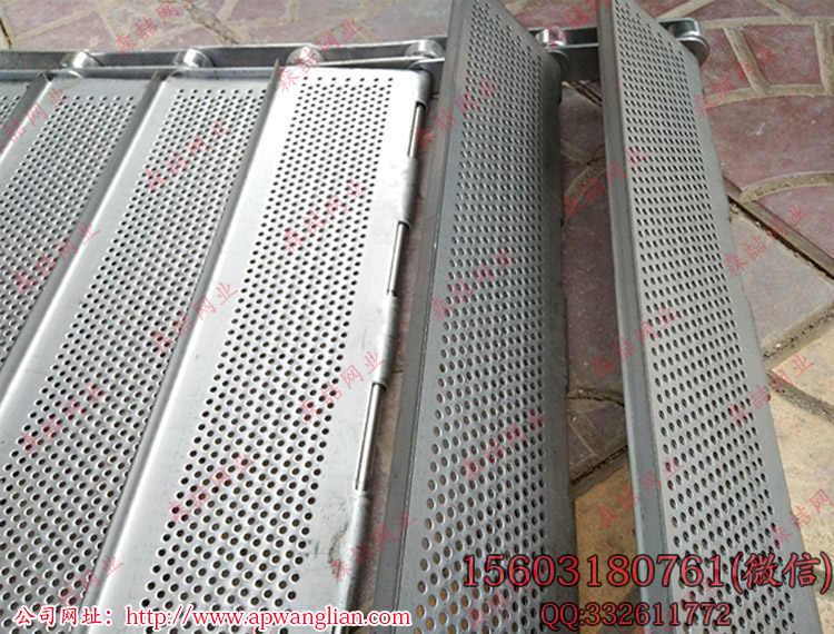 翻板式輸送帶的運輸上和一般鏈板輸送帶沒有區別,也非常適用于各種小顆粒或者大件箱包類產品的輸送,這種輸送帶的網板采用的是一邊折彎穿進串桿,這樣就可以和合頁一樣來回翻動,不過在生產時一定要注意每塊網板要搭在下一塊網板的串桿位置,這樣才能確保承載能力。在網帶運行到輸送機的下面時網板會全部張開垂直向下,這樣有利于輸送帶上殘留的物料清除干凈,同時也方便輸送網帶的日常清洗。翻板輸送帶網板的末端還可以折彎處理,這樣應用 在一些帶有爬坡的輸送機上可以當作隔板使用。